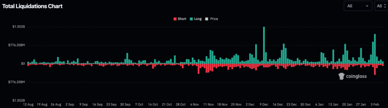 他估计总爆仓金额在80亿至100亿美元之间。这与各交易所24小时内观察到的未平仓合约减少量更为相符合,Bybit的未平仓合约总量从2月2日至3日减少了40亿美元,而币安一家则减少了50亿美元。