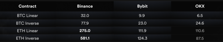 在Bybit和OKX等其他交易所,这种折价幅度并不明显,ETH合约的折价接近1%。三个交易所的BTC合约表现好于ETH,因为抛售主要集中在ETH合约,特别是币本位(反向)合约上。
